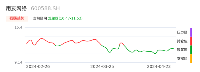 我们来看一下该股的九方特色指标强弱趋势的情况:用友网络自04月02日从持仓区下穿到观望区。股价近期持续下跌后,短期出现止跌迹象。后续重点关注能否再次站上多空分界点:11.53元。如未能有效突破则可能进入新一轮空头行情。