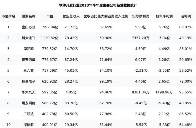 用友网络最新报告期数据为半年度,下表汇总了软件开发行业内市值靠前的公司半年度主要经营数据