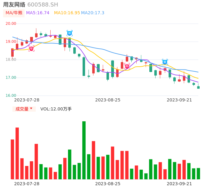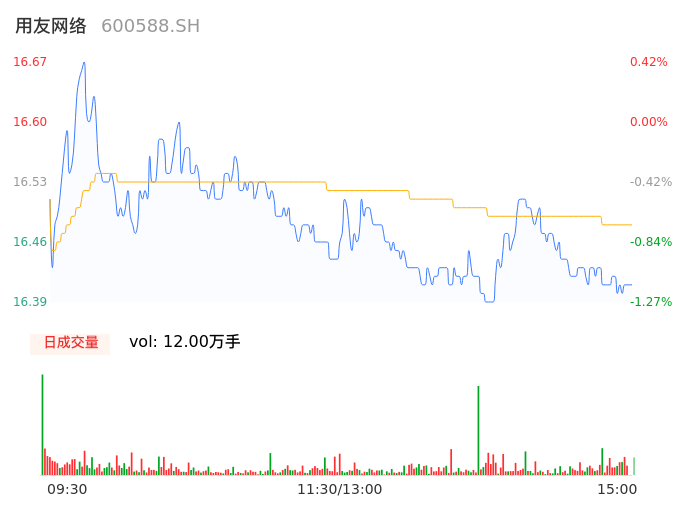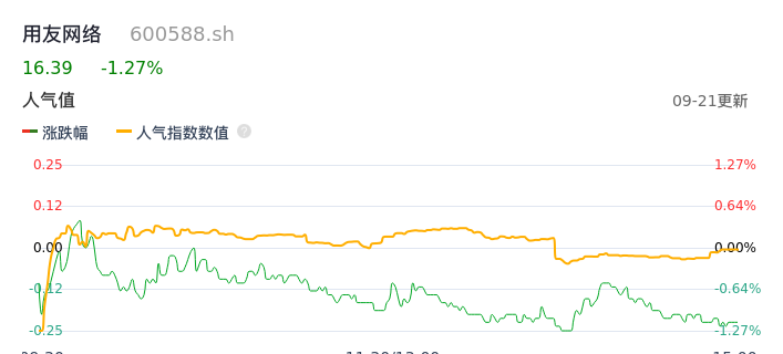 09月21日,用友网络收报16.39,股价涨幅-1.27%,成交金额1.98亿元,换手率0.35%。