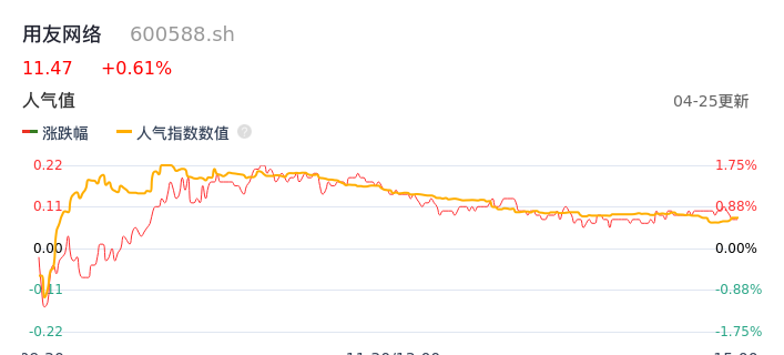 04月25日,用友网络收报11.47,股价涨幅0.61%,成交金额2.31亿元,换手率0.59%。