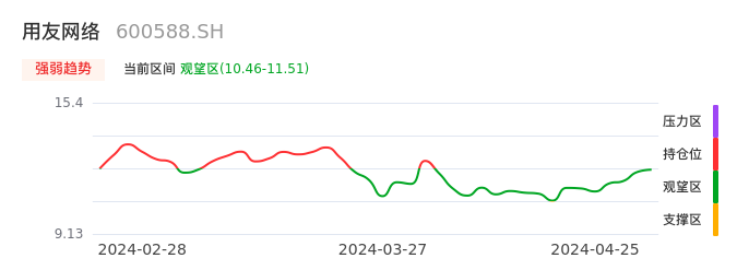 我们来看一下该股的九方特色指标强弱趋势的情况:用友网络自04月02日从持仓区下穿到观望区。股价近期持续下跌后,短期出现止跌迹象。后续重点关注能否再次站上多空分界点:11.51元。如未能有效突破则可能进入新一轮空头行情。