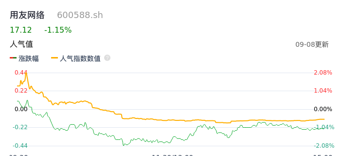 09月08日,用友网络收报17.12,股价涨幅-1.15%,成交金额2.43亿元,换手率0.42%。