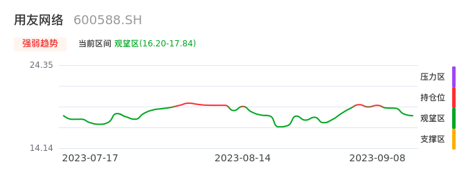 我们来看一下该股的九方特色指标强弱趋势的情况:用友网络自09月05日从持仓区下穿到观望区,股价近期持续走弱。短期已经进入空头行情,且下跌动能仍未衰竭。建议继续谨慎观望。
