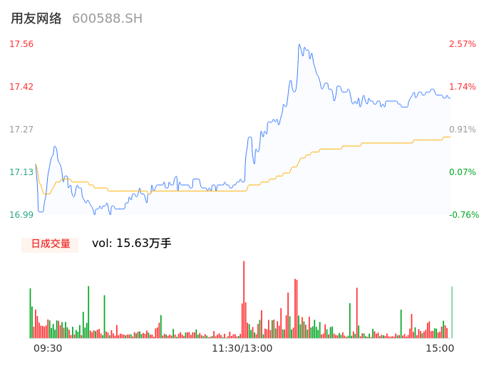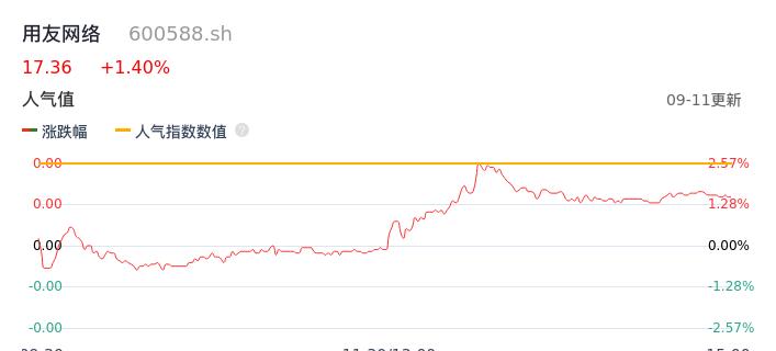 09月11日,用友网络收报17.36,股价涨幅1.40%,成交金额2.70亿元,换手率0.46%。