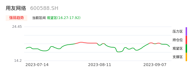 我们来看一下该股的九方特色指标强弱趋势的情况:用友网络自09月05日从持仓区下穿到观望区,股价近期持续走弱。短期已经进入空头行情,且下跌动能仍未衰竭。建议继续谨慎观望。