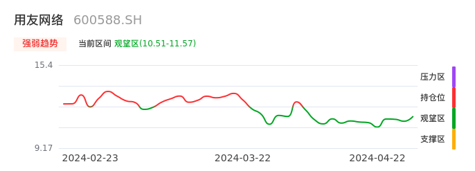 我们来看一下该股的九方特色指标强弱趋势的情况:用友网络自04月02日从持仓区下穿到观望区。股价近期持续下跌后,短期出现止跌迹象。后续重点关注能否再次站上多空分界点:11.57元。如未能有效突破则可能进入新一轮空头行情。