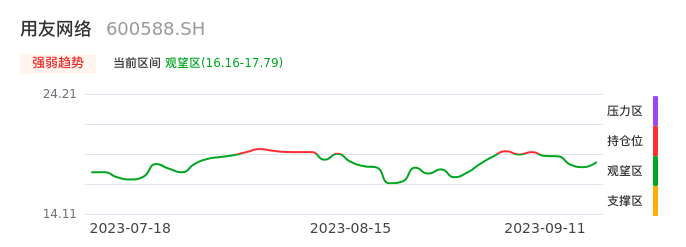 我们来看一下该股的九方特色指标强弱趋势的情况:用友网络自09月05日从持仓区下穿到观望区。股价近期持续下跌后,短期出现止跌迹象。后续重点关注能否再次站上多空分界点:17.79元。如未能有效突破则可能进入新一轮空头行情。