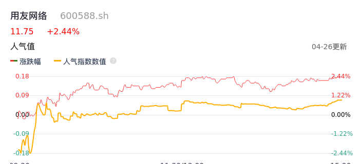 04月26日,用友网络收报11.75,股价涨幅2.44%,成交金额2.52亿元,换手率0.63%。