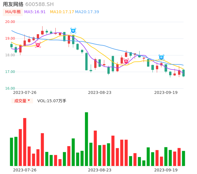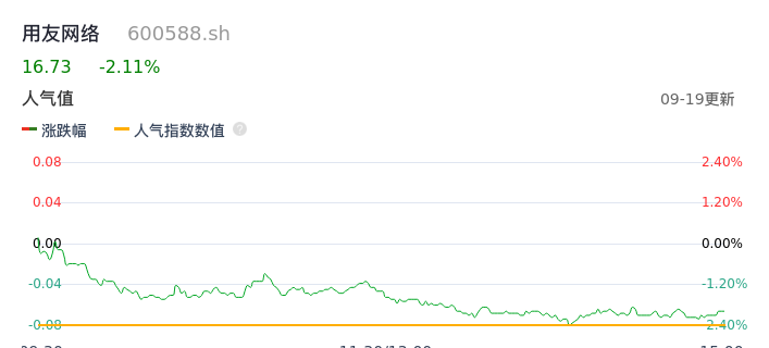 09月19日,用友网络收报16.73,股价涨幅-2.11%,成交金额2.53亿元,换手率0.44%。