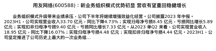 值得注意的是:2023年09月海通证券的杨林/洪琳分析师,首次发布关于用友网络的研究报告,标题为:用友网络(600588):新业务组织模式优势初显 营收有望重回稳健增长。