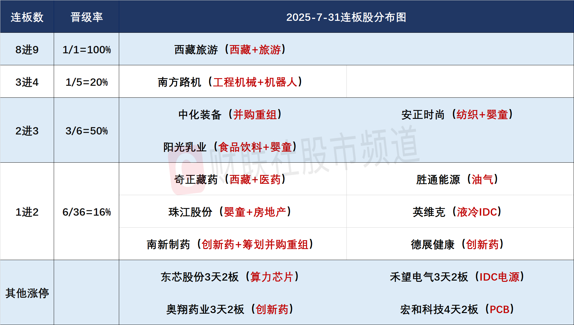 今日共43股涨停,连板股总数11只,其中三连板及以上个股5只,上一交易日共12只连板股,连板股晋级率41.67%(不含ST股、退市股)。
