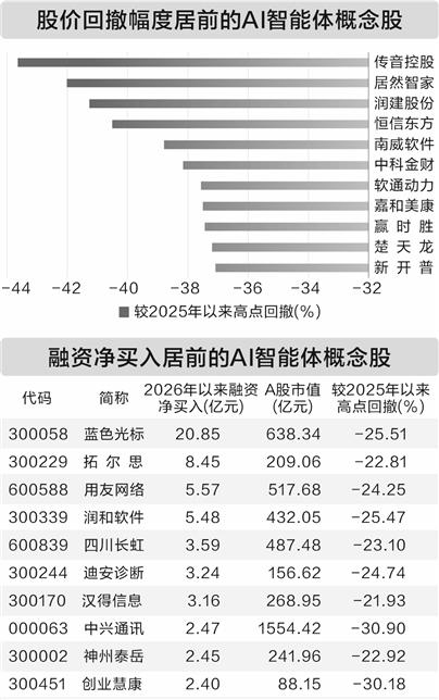 2026年以来,证券市场AI智能体概念热度爆棚,诞生多只牛股,近期随着热度降温,不少概念股已出现明显回撤。据证券时报·数据宝统计,截至1月20日,最新收盘价较2025年以来高点回撤幅度在20%以上的AI智能体概念股有90余只。资金流向方面,截至1月19日,上述回撤20%以上的AI智能体概念股中,2026年以来获得融资净买入超1亿元的有17只,如蓝色光标、拓尔思、用友网络、润和软件、四川长虹等。