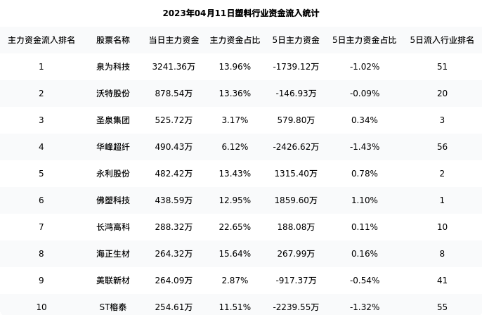 从主力资金流向来看,塑料行业今日主力资金流入6.56亿元,在所有申万二级行业中排名:87/131。