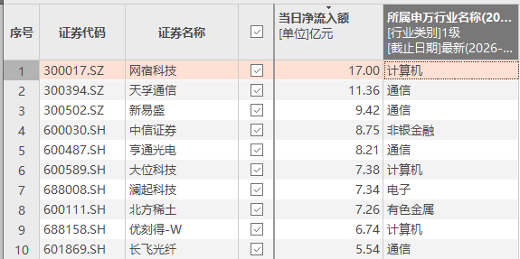 资金风向标 | 网宿科技、天孚通信获大额资金净流入