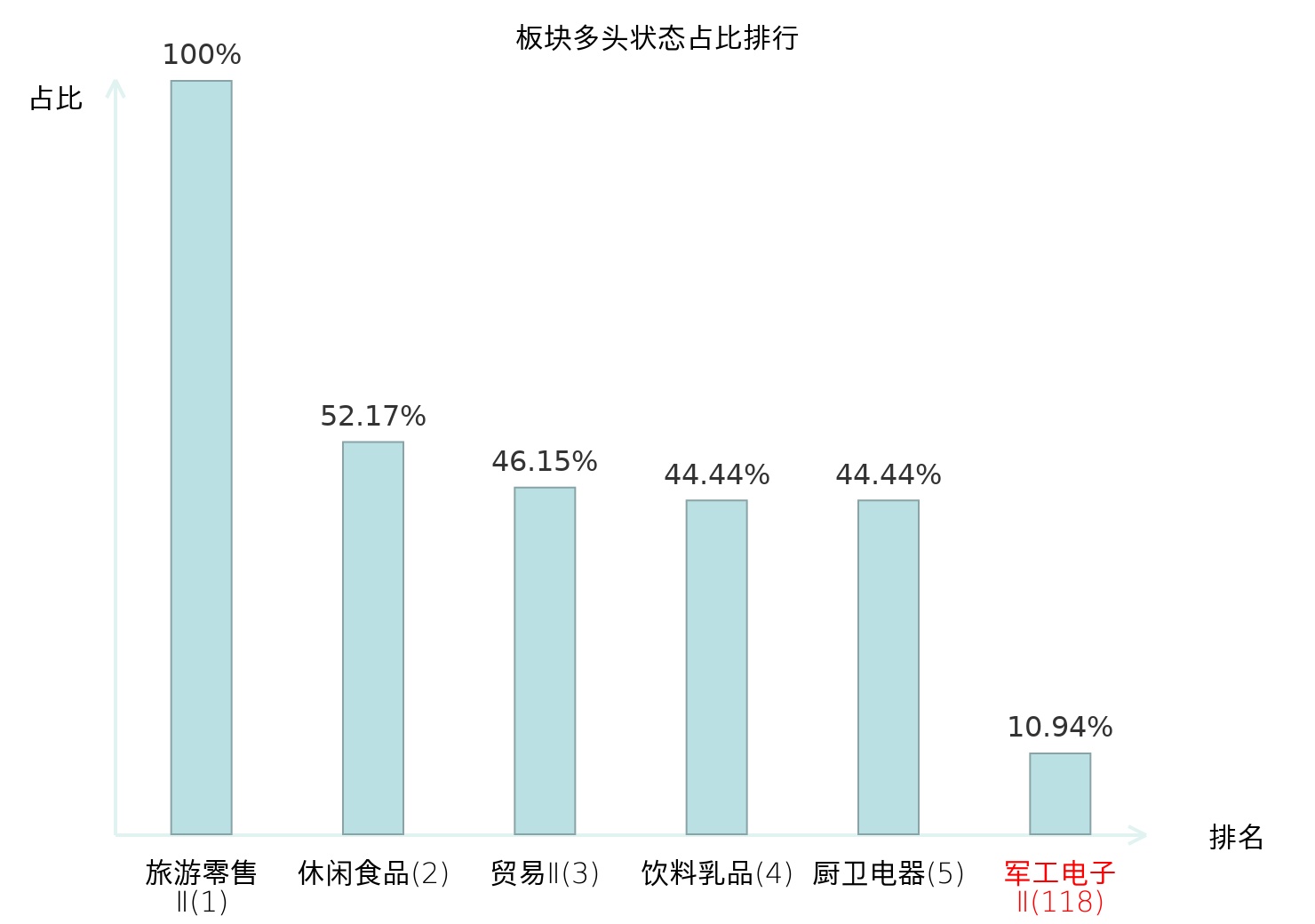 全市场所有行业板块中主力多头状态占比排名中,旅游零售Ⅱ板块位居第一。乘用车板块名次提升最快,较昨日上升91位。