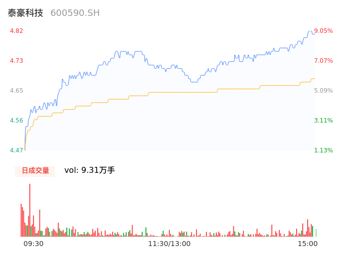 04月17日,泰豪科技收报4.80,股价涨幅8.60%,成交金额4353.67万元,换手率1.10%。