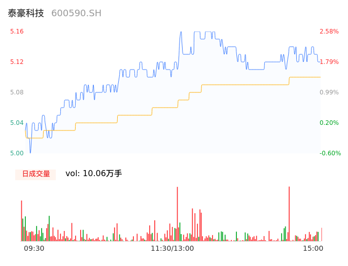 04月26日,泰豪科技收报5.13,股价涨幅1.99%,成交金额5131.06万元,换手率1.19%。