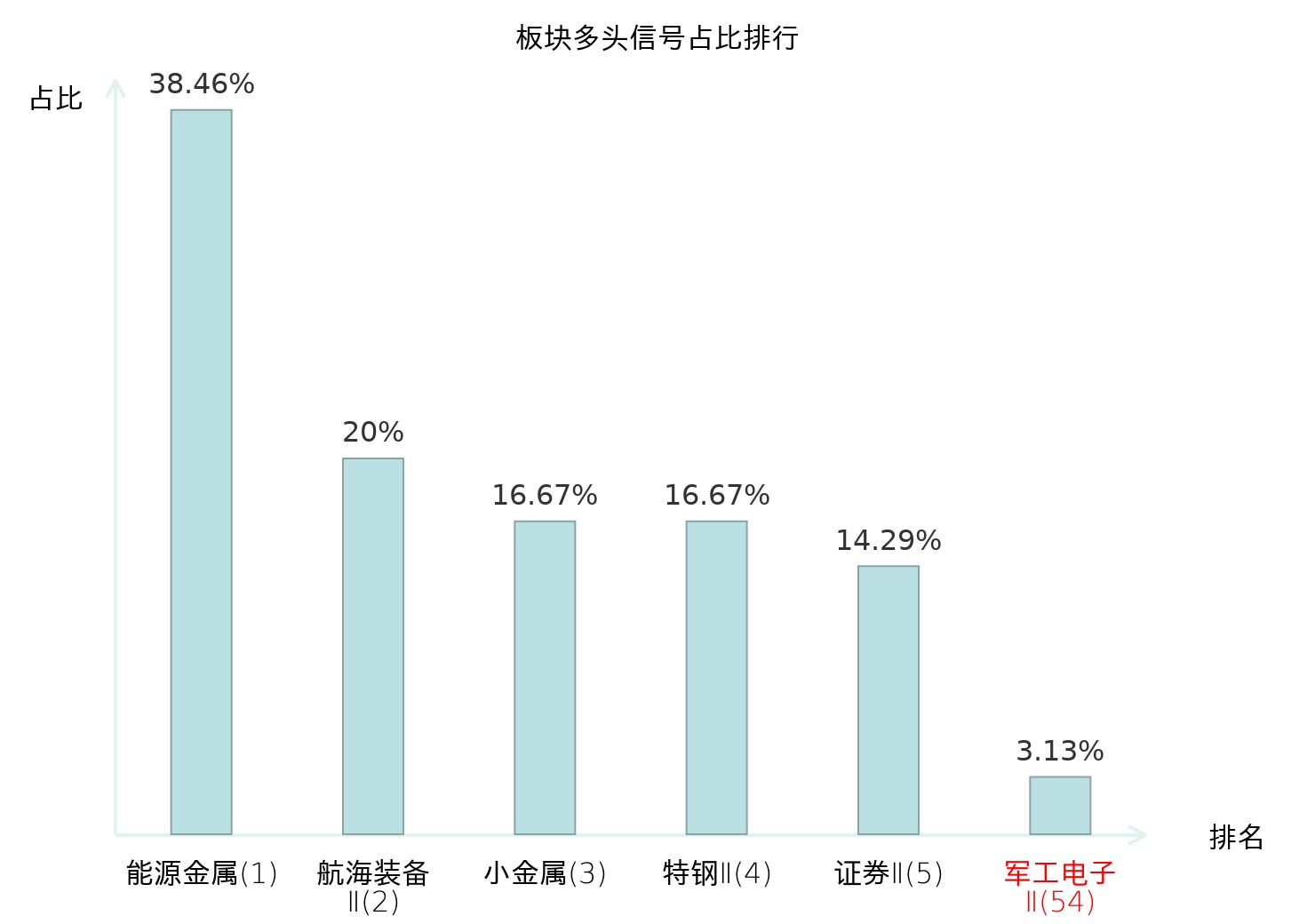全市场所有行业板块中主力多头信号占比排名中,能源金属板块位居第一。航海装备Ⅱ板块名次提升最快,较昨日上升112位。