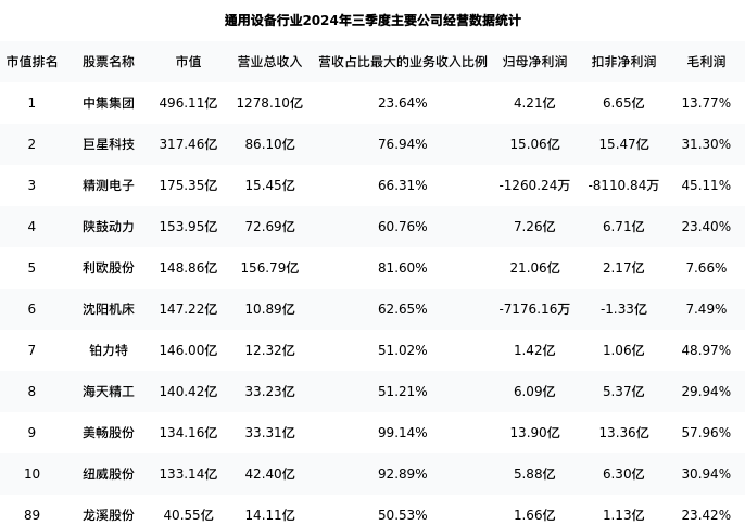 龙溪股份最新报告期数据为三季度,下表汇总了通用设备行业内市值靠前的公司三季度主要经营数据