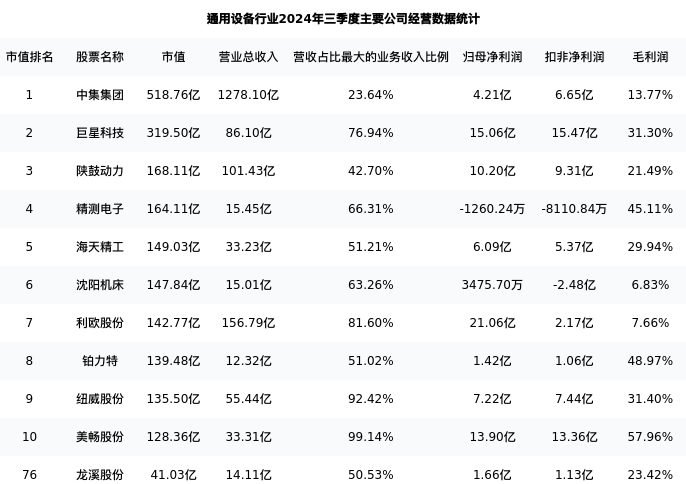 龙溪股份最新报告期数据为三季度,下表汇总了通用设备行业内市值靠前的公司三季度主要经营数据