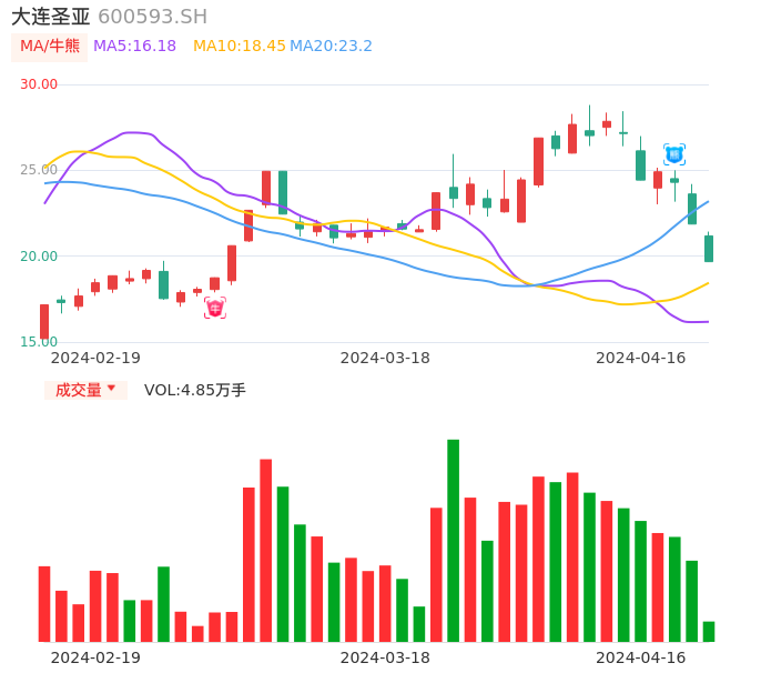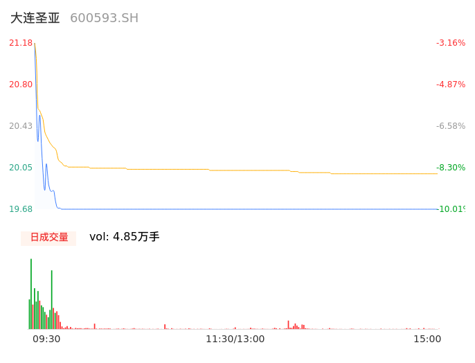 04月16日,大连圣亚收报19.68,股价涨幅-10.01%,成交金额9703.65万元,换手率3.77%。