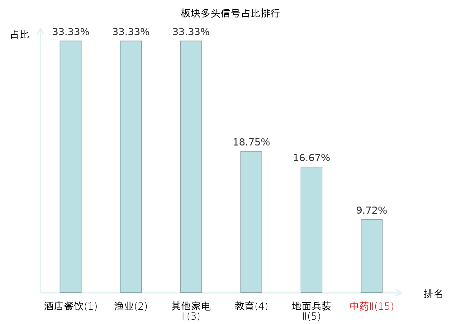 全市场所有行业板块中主力多头信号占比排名中,酒店餐饮板块位居第一。其他家电Ⅱ板块名次提升最快,较昨日上升126位。