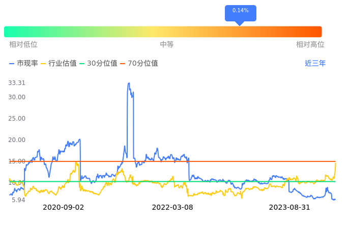 2023年09月01日,中孚实业上涨2.44%收于2.94,今日成交金额1.22亿元。下文将从市盈率PETTM、市净率PB、市现率3个角度去分析公司估值情况。