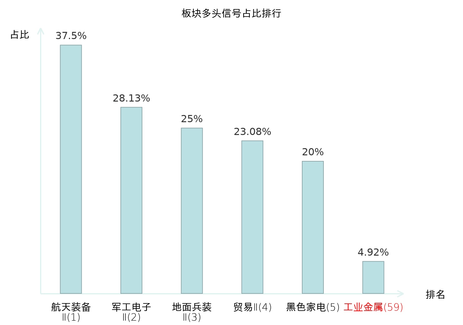 全市场所有行业板块中主力多头信号占比排名中,航天装备Ⅱ板块位居第一。航天装备Ⅱ板块名次提升最快,较昨日上升120位。