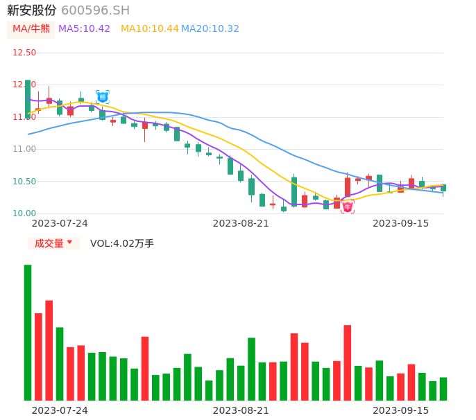 09月15日,新安股份收报10.35,股价涨幅-0.29%,成交金额4168.46万元,换手率0.39%。