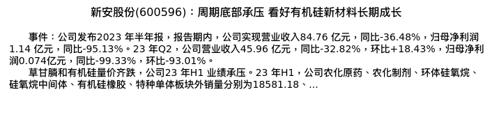 值得注意的是:2023年09月首创证券的翟绪丽分析师,首次发布关于新安股份的研究报告,标题为:新安股份(600596):周期底部承压 看好有机硅新材料长期成长。