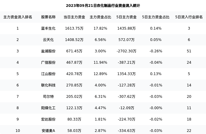从主力资金流向来看,农化制品行业今日主力资金流入6.16亿元,在所有申万二级行业中排名:113/131。