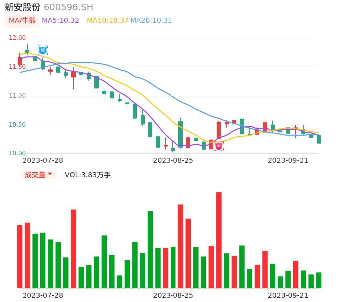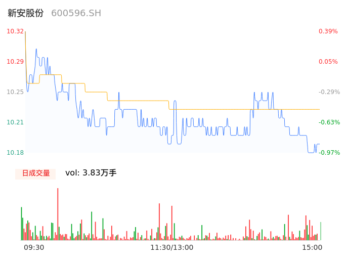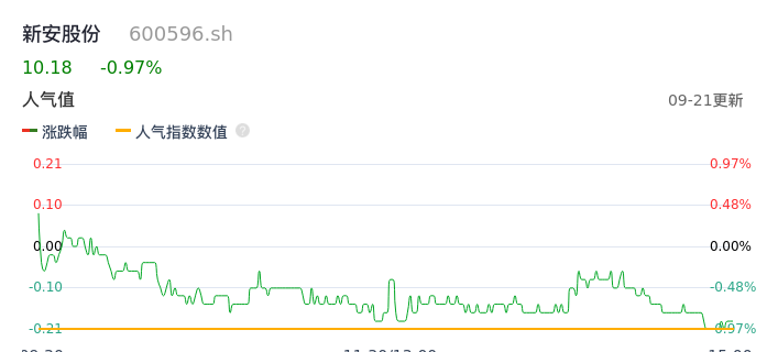 09月21日,新安股份收报10.18,股价涨幅-0.97%,成交金额3912.79万元,换手率0.37%。