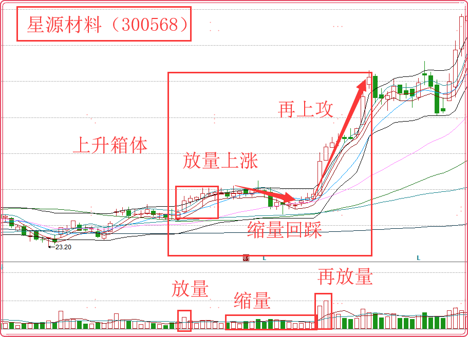 如果确定上述三要素都齐备,那么就是符合上升箱体战法要求。接下来就是按照回踩支撑位确定买入的价格和时间。