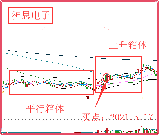 神思电子在2021.2.9-5.7出现平行箱体走势,在2021.5.7-6.2走出上升箱体走势,买点出现在5月17日的上攻后回踩的支撑位。