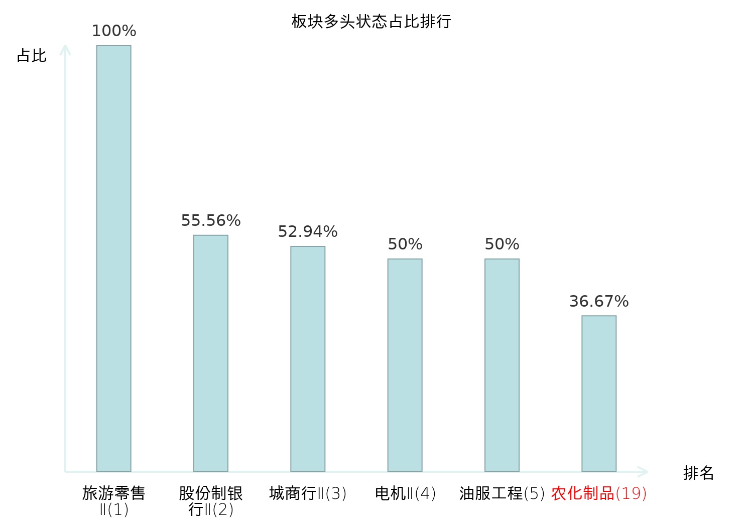 全市场所有行业板块中主力多头状态占比排名中,旅游零售Ⅱ板块位居第一。互联网电商板块名次提升最快,较昨日上升65位。