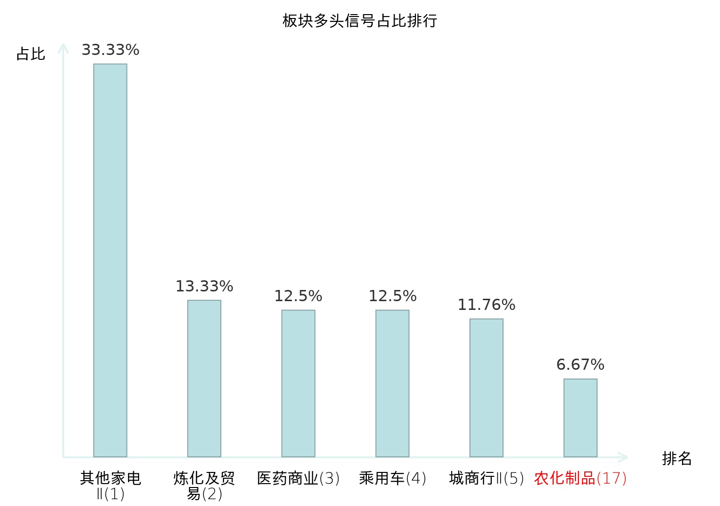 全市场所有行业板块中主力多头信号占比排名中,其他家电Ⅱ板块位居第一。其他家电Ⅱ板块名次提升最快,较昨日上升128位。
