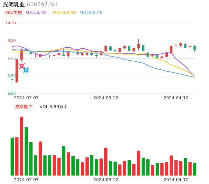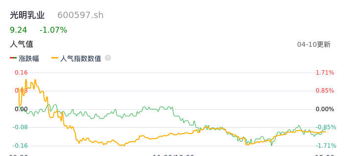 04月10日,光明乳业收报9.24,股价涨幅-1.07%,成交金额5560.89万元,换手率0.43%。