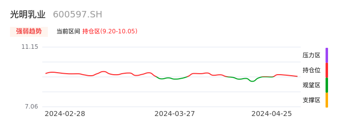 我们来看一下该股的九方特色指标强弱趋势的情况:光明乳业自04月22日从观望区上穿到持仓区。股价近期在多头区域回调整理。后续重点关注多空分界点的争夺:9.20元。如未能有效站稳则可能重新回到空头行情。