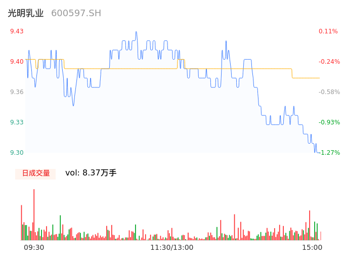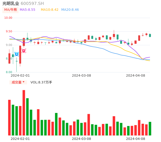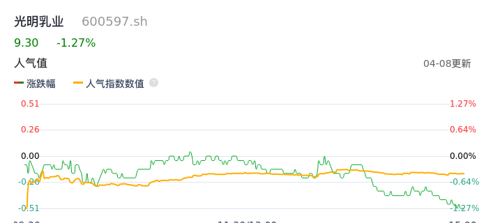 04月08日,光明乳业收报9.30,股价涨幅-1.27%,成交金额7843.09万元,换手率0.61%。
