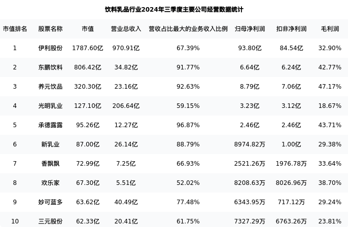 光明乳业最新报告期数据为三季度,下表汇总了饮料乳品行业内市值靠前的公司三季度主要经营数据