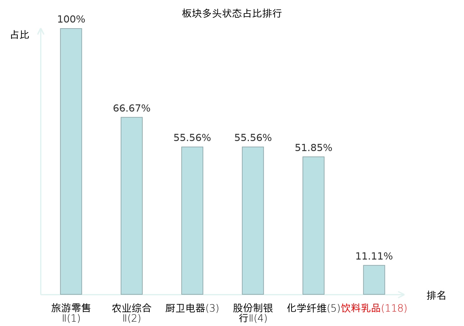全市场所有行业板块中主力多头状态占比排名中,旅游零售Ⅱ板块位居第一。国有大型银行Ⅱ板块名次提升最快,较昨日上升103位。