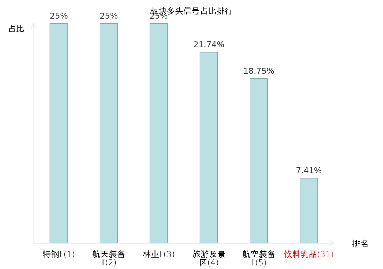全市场所有行业板块中主力多头信号占比排名中,特钢Ⅱ板块位居第一。林业Ⅱ板块名次提升最快,较昨日上升122位。