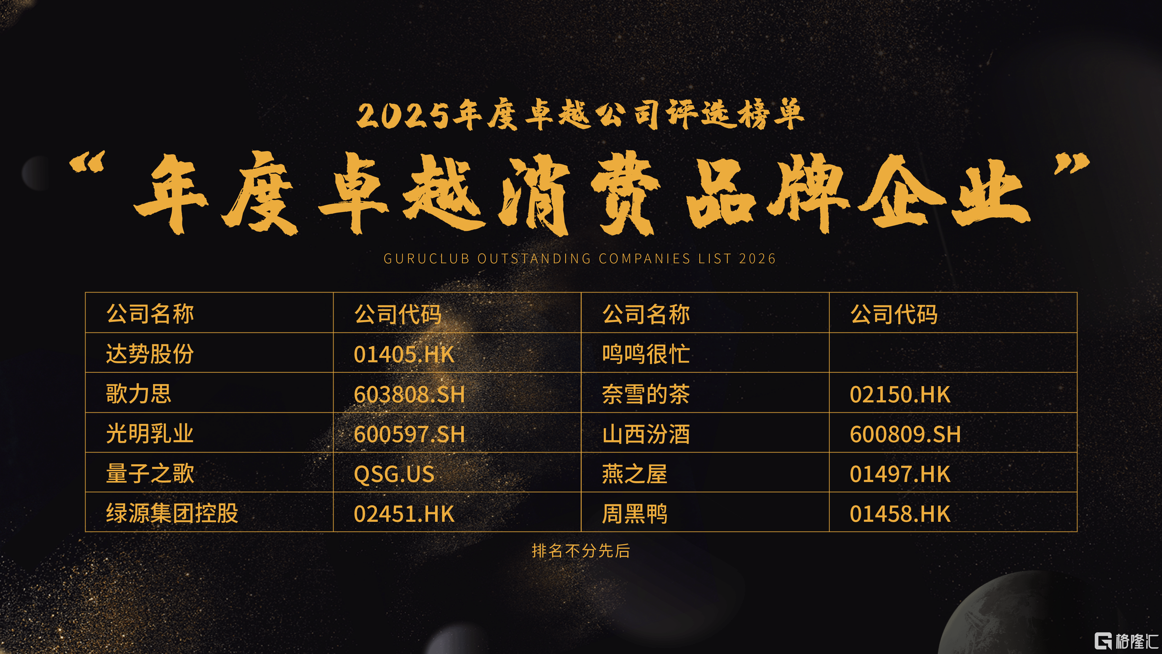 12月22日,格隆汇在线上举办"科技赋能·资本破局"分享会。本次分享会,备受瞩目的卓越公司评选榜单将隆重揭晓,其中格隆汇“金格奖”年度卓越公司评选中,达势股份(01405.HK)、歌力思(603808.SH)、光明乳业(600597.SH)、量子之歌(QSG.US)、绿源集团控股(02451.HK)、鸣鸣很忙、奈雪的茶(02150.HK)、山西汾酒(600809.SH)、燕之屋(01497.HK)、周黑鸭(01458.HK)10家企业荣获“年度卓越消费品牌企业”奖项。(排名不分先后,按公司首部字母顺序排列)