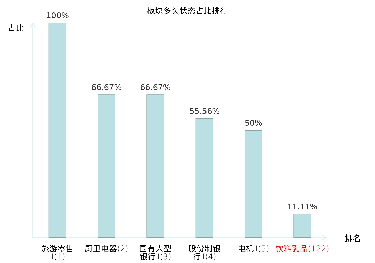 全市场所有行业板块中主力多头状态占比排名中,旅游零售Ⅱ板块位居第一。水泥板块名次提升最快,较昨日上升80位。