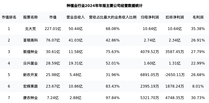 北大荒最新报告期数据为年报,下表汇总了种植业行业内市值靠前的公司年报主要经营数据