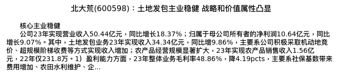 值得注意的是:2024年04月中航证券的彭海兰/陈翼分析师,首次发布关于北大荒的研究报告,标题为:北大荒(600598):土地发包主业稳健 战略和价值属性凸显。