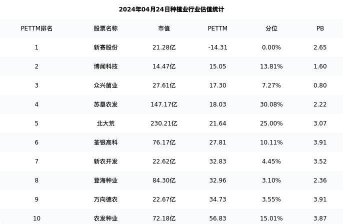 从估值角度看:北大荒最新市盈率PETTM为21.64,在行业内排名4/20,处于25.00分位。