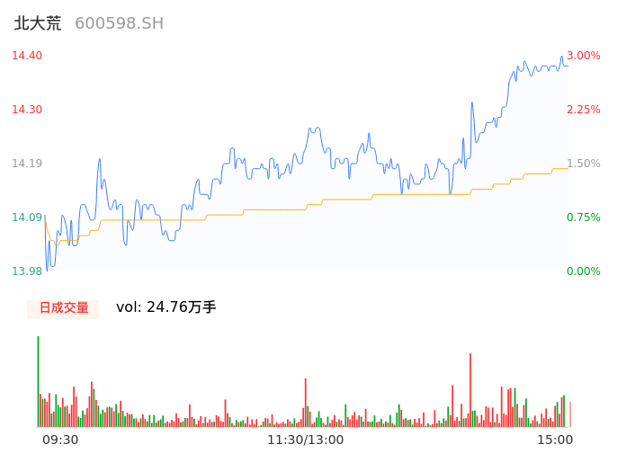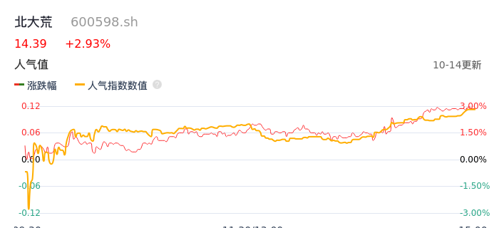 10月14日,北大荒收报14.39,股价涨幅2.93%,成交金额3.51亿,换手率1.39%。