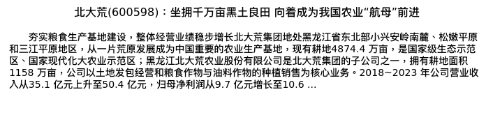值得注意的是:2024年09月浙商证券的钟凯锋/邱冠华/张心怡/江路分析师,首次发布关于北大荒的研究报告,标题为:北大荒(600598):坐拥千万亩黑土良田 向着成为我国农业“航母”前进。