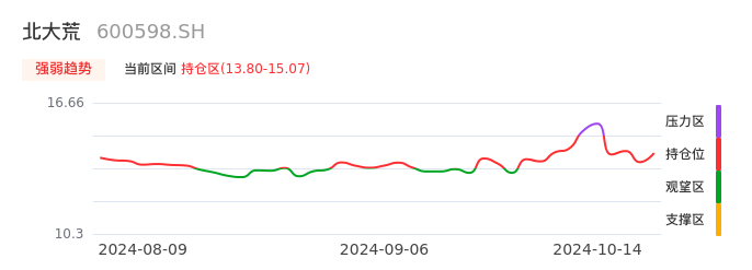 我们来看一下该股的九方特色指标强弱趋势的情况:北大荒自10月09日从压力区回到持仓区。股价在持仓区盘整一段时间后,目前有启稳迹象。后续重点关注上方压力位:15.07元是否能重新上攻。
